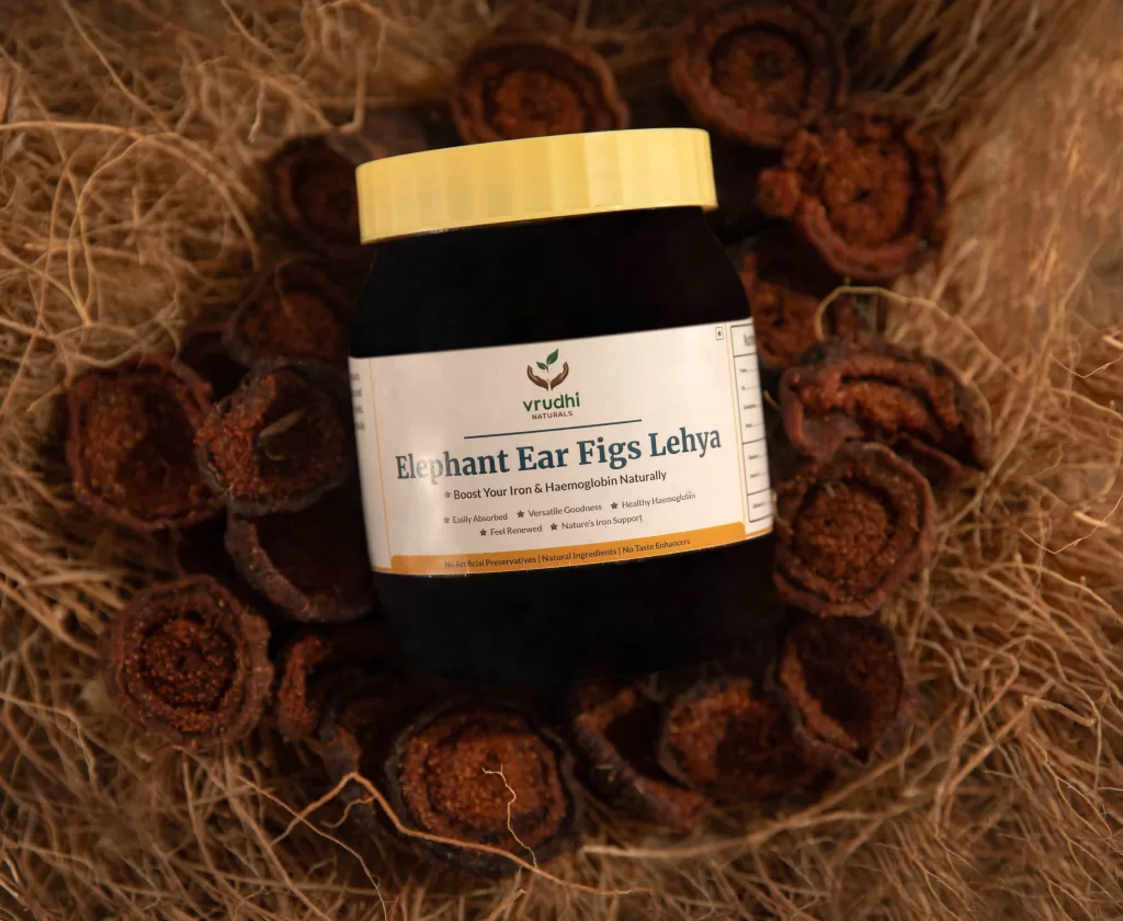 That’s why Vrudhi Elephant ear figs lehya is different. Made from rare, jumbo sized figs grown in the Western Ghats of Karnataka, these figs have been used for generations to elevate Hb and ferritin levels naturally and quickly. Many women struggle with low iron impacting their daily lives, leaving them fatigued, weak, and unable to function at their best. That is why this jar was created—to be more than just a supplement, but a true home treatment for anemia. A few spoonfuls every day is all it takes to help rebuild your strength. Because iron should come from food, not from pills.