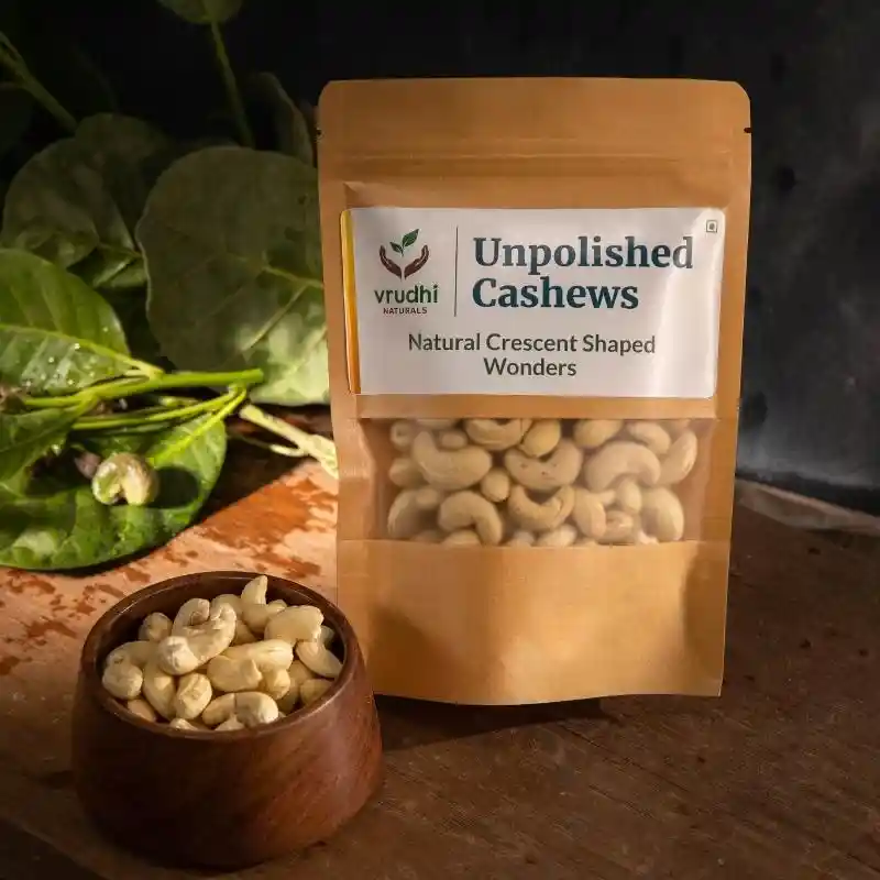 That’s where Vrudhi Cashews are different. Unpolished, raw, real. No artificial shine, no long storage tricks, no chemicals to make them look uniform. These cashews are grown in Karnataka, processed in small batches, and stored with their skin until ready for use. They may look smaller, they may not be perfectly shaped, but they are packed with real nutrients and rich flavour that mass-produced cashews can never match. Because food should be fresh, not preserved for months on a shelf.